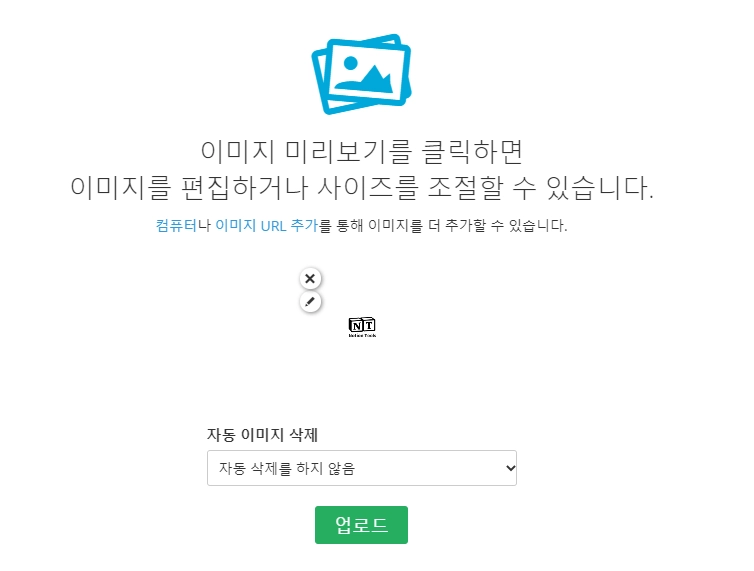 2. 자동 이미지 삭제를 자동 삭제를 하지 않음 으로 하고 업로드 버튼을 눌러주세요