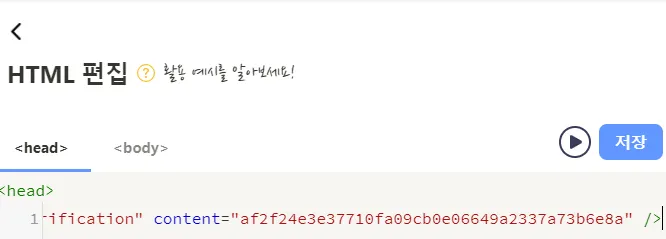HTML 편집의 <head>를 선택하고 아래 입력칸에 방금 복사한 메타 태그 를 붙여넣고 저장 버튼을 누르세요.