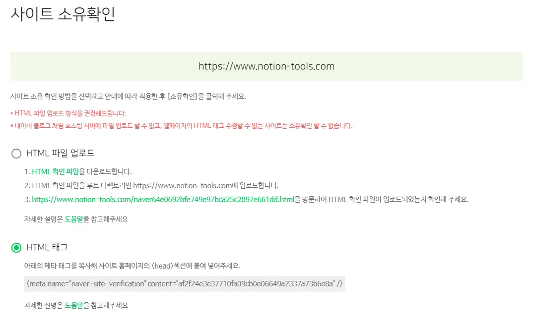 사이트 소유 확인 창에서 HTML 태그 를 클릭하고 아래 메타 태그를 복사해주세요.